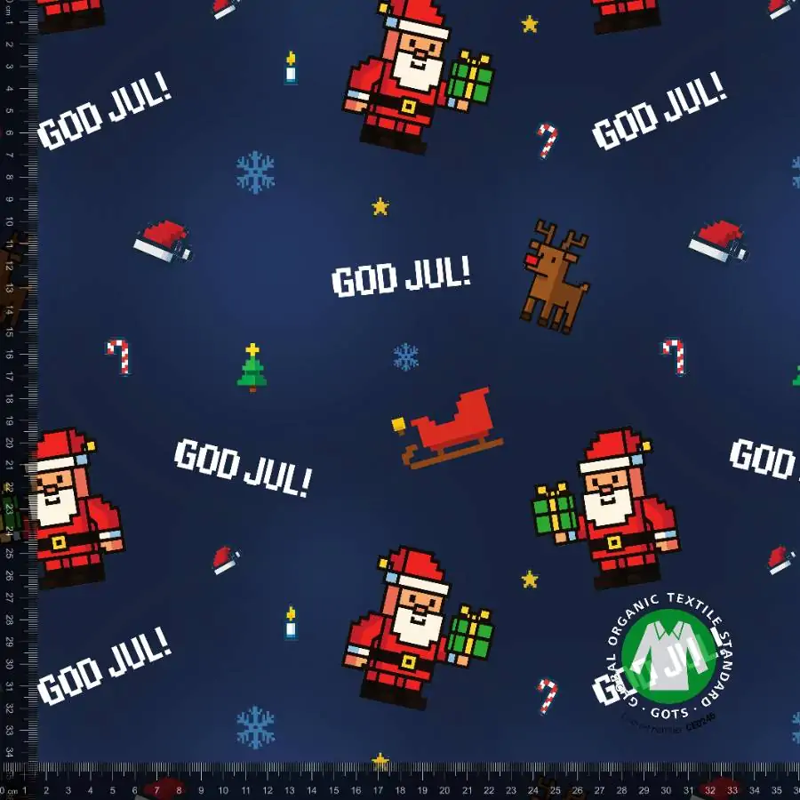 French Terry med “GOD JUL” – navy er ØKOTEX KLASSE 1 certificeret, med en bredde på 155-160 cm og en vægtfylde på 235 g/m2, kvaliteten består af 95% bomuld / 5 % elastan.