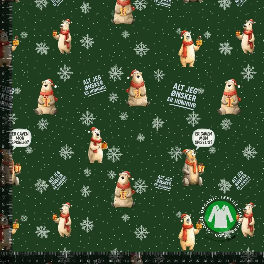 French Terry med sjove jule bjørne – grøn er ØKOTEX KLASSE 1 certificeret, med en bredde på 155-160 cm og en vægtfylde på 235 g/m2, kvaliteten består af 95% bomuld / 5 % elastan.