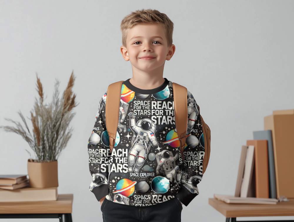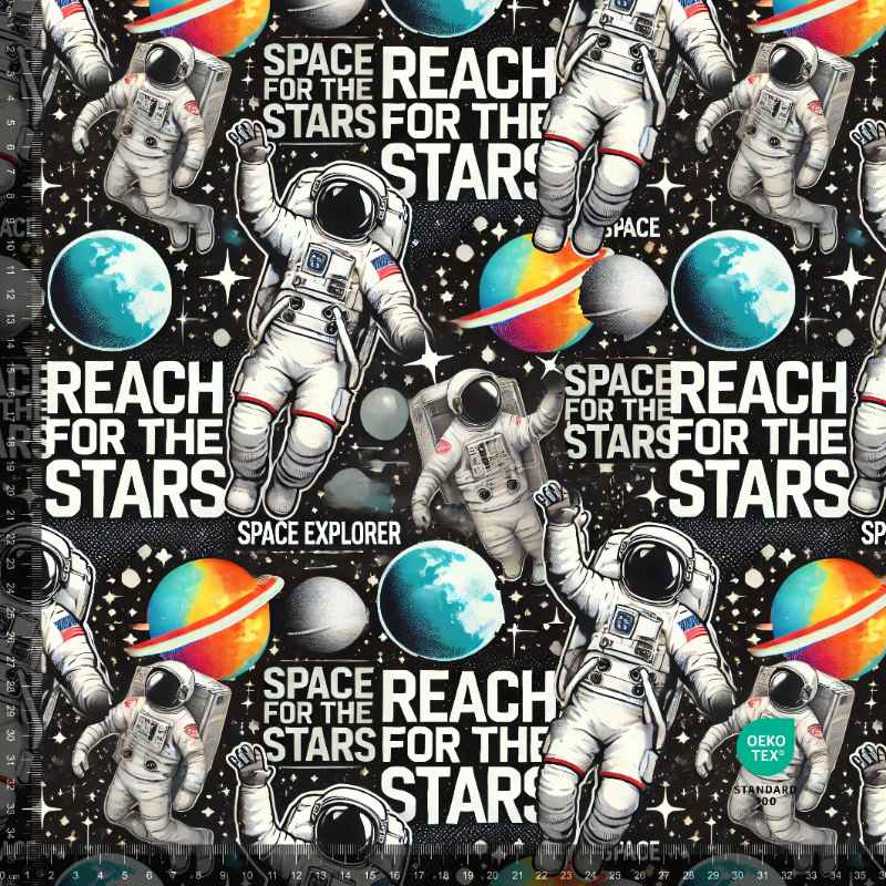 Vores French Terry print med Rum tema er ØKOTEX KLASSE 1 certificeret, med en bredde på 155-160 cm og en vægtfylde på 235 g/m2, kvaliteten består af 95% bomuld / 5 % elastan.