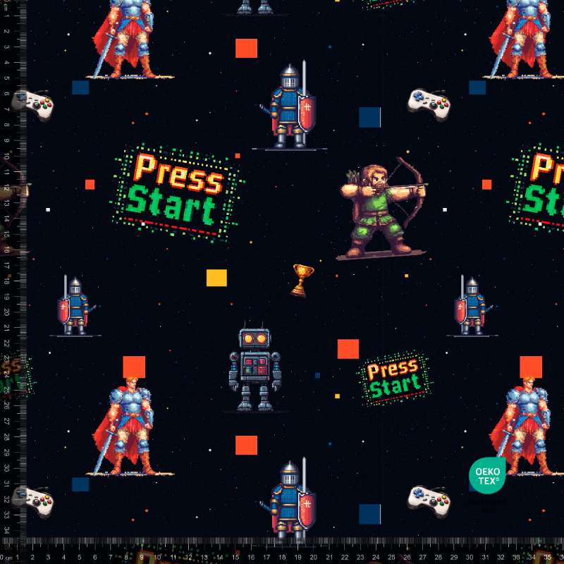 Vores French Terry print med retro gaming er ØKOTEX KLASSE 1 certificeret, med en bredde på 155-160 cm og en vægtfylde på 235 g/m2, kvaliteten består af 95% bomuld / 5 % elastan.