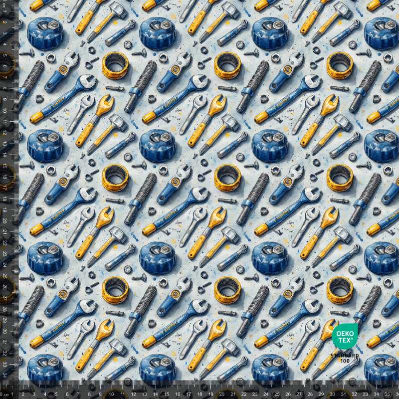 Vores French Terry print med værktøj er ØKOTEX KLASSE 1 certificeret, med en bredde på 155-160 cm og en vægtfylde på 235 g/m2, kvaliteten består af 95% bomuld / 5 % elastan.