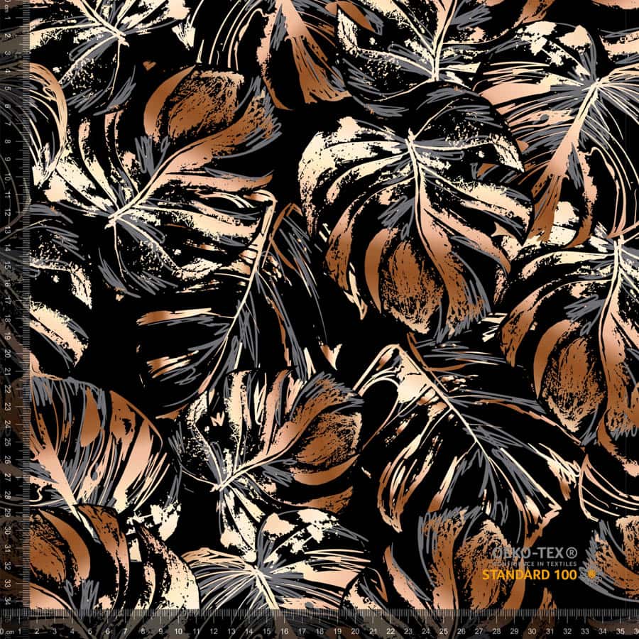 Jerseyprint med guldblade, i en super god kvalitet. Kvaliteten på stoffet er bomuld 95% og lycra 5%..