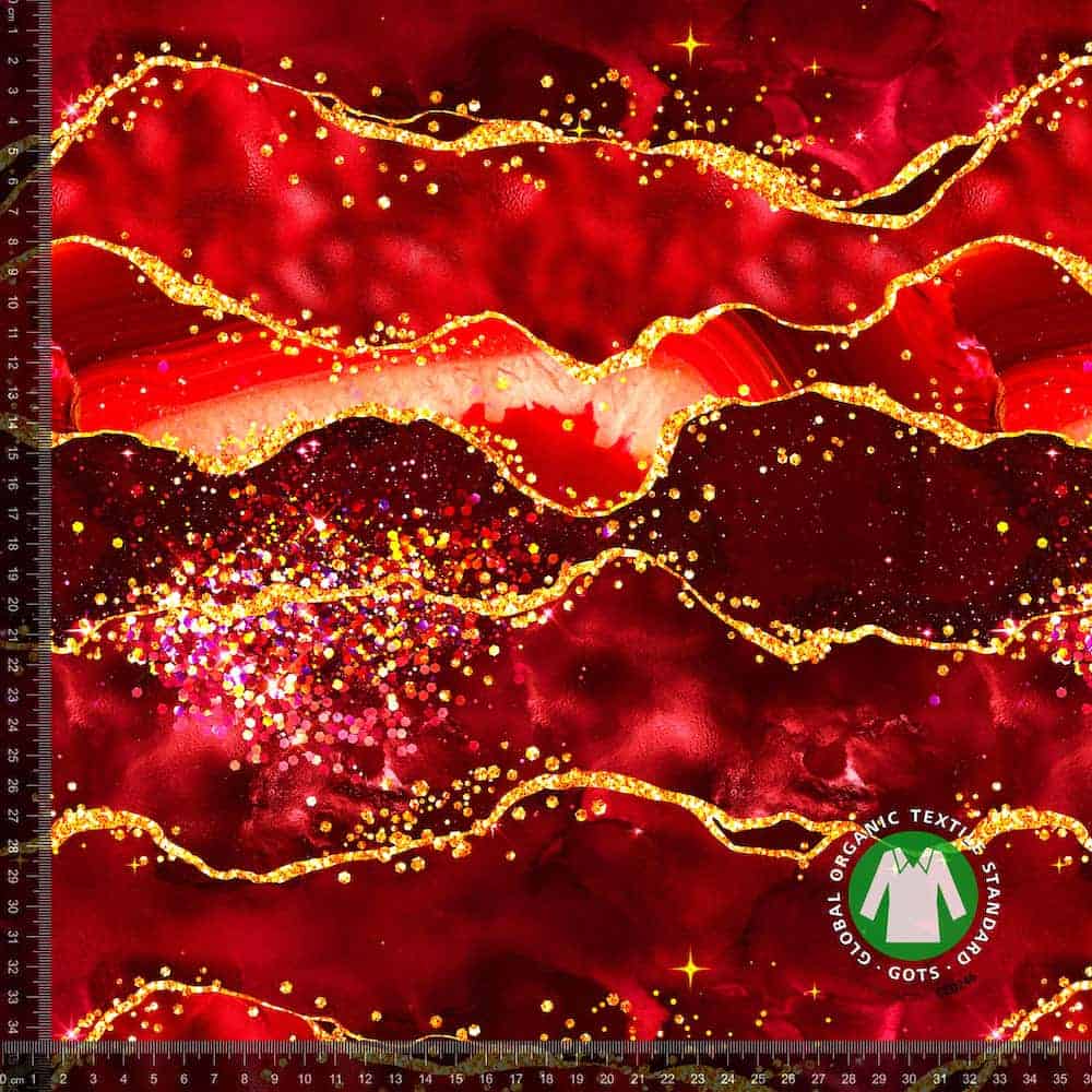 Jersey print med rød pensel glitter i en super god kvalitet. Kvaliteten på stoffet er bomuld 95% og lycra 5%