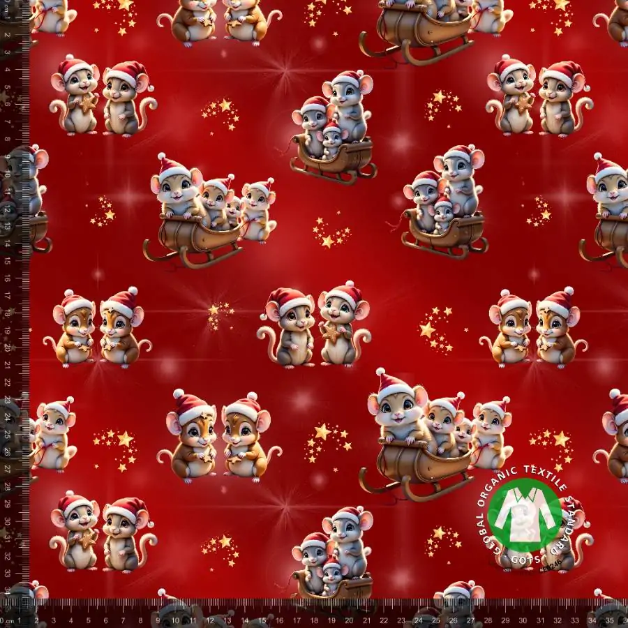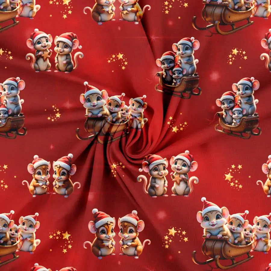 Jersey print med søde julemus – rød, er i en super god kvalitet. Kvaliteten på stoffet er bomuld 95% og lycra 5%