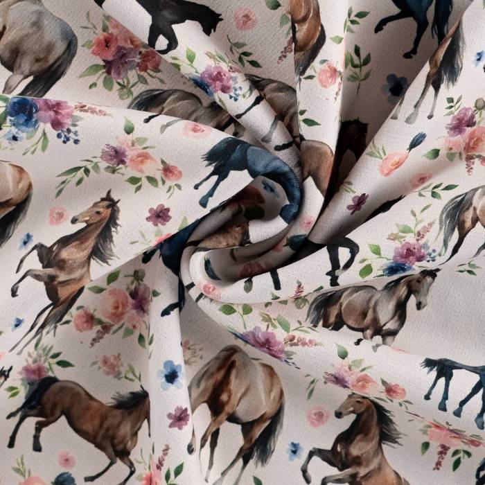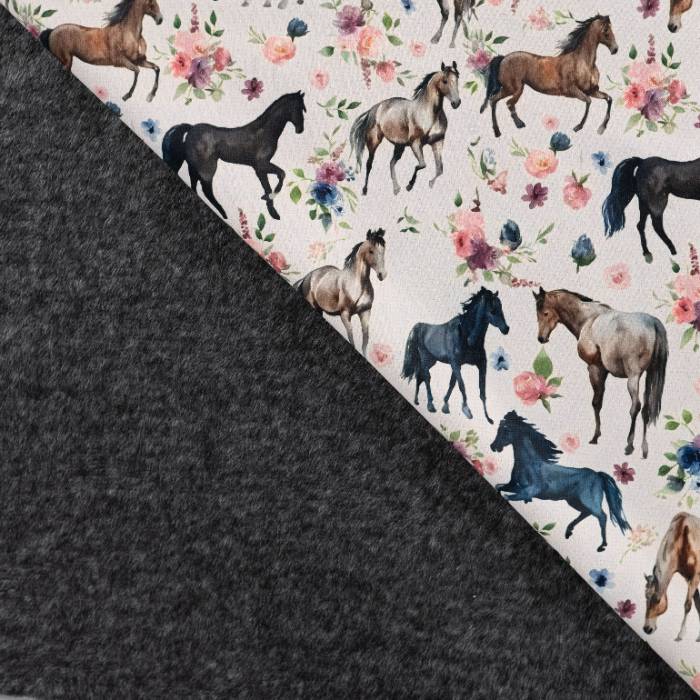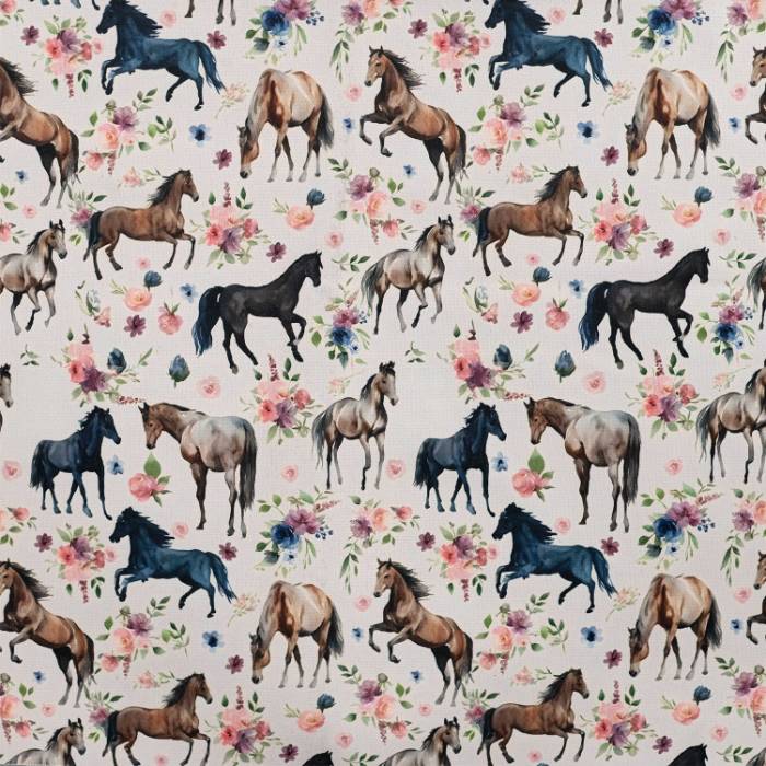 Kraftig jogging – Heste og blomster, er en kvalitet med en kombination af 60% polyester 36% bomuld 4% elastan