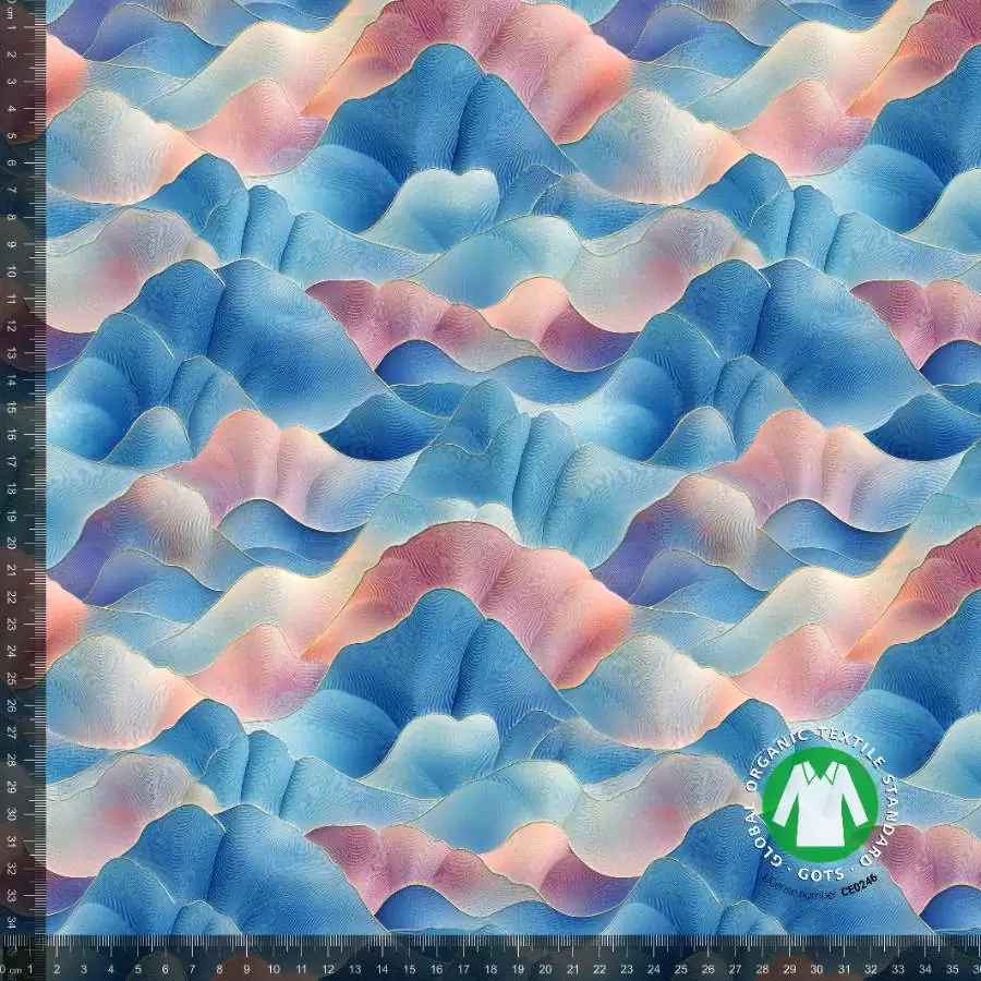Jersey print abstrakte bjerge blå i en super god kvalitet. Kvaliteten på stoffet er bomuld 95% og lycra 5%