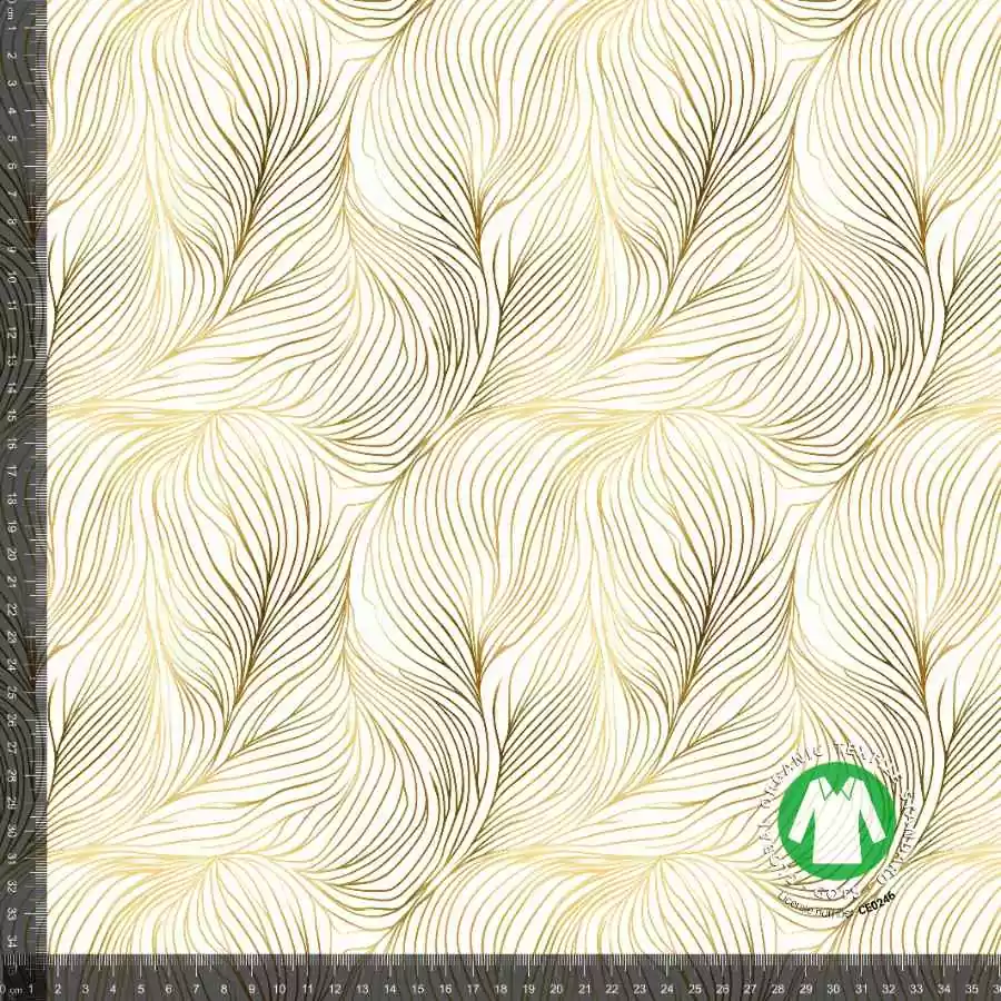 Jersey print abstrakte fjer guld i en super god kvalitet. Kvaliteten på stoffet er bomuld 95% og lycra 5%