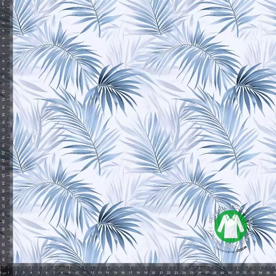 Jersey print grene og blade blå i en super god kvalitet. Kvaliteten på stoffet er bomuld 95% og lycra 5%