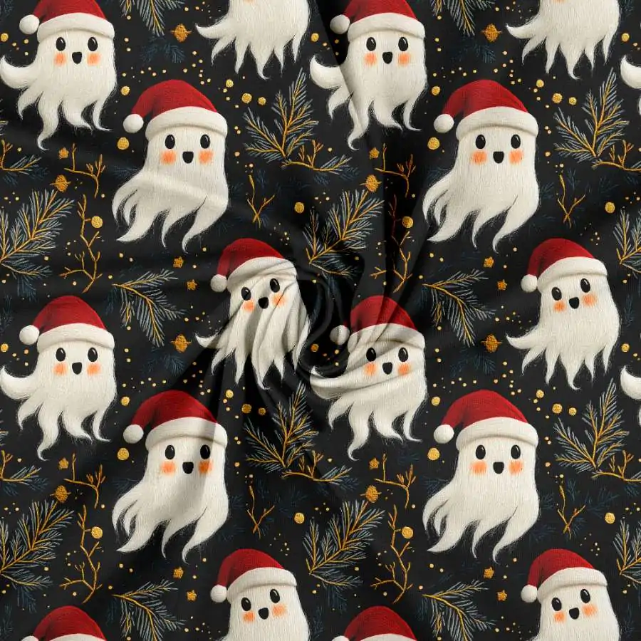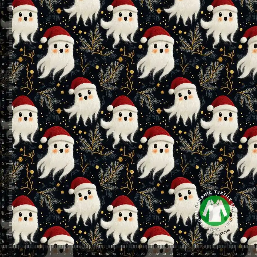 Jersey print med broderede jule spøgelser, er i en super god kvalitet. Kvaliteten på stoffet er bomuld 95% og lycra 5%