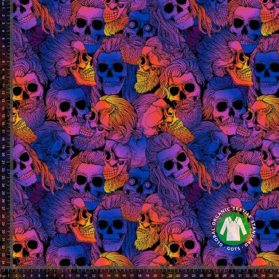 Jersey print med Neon skulls i en super god kvalitet. Kvaliteten på stoffet er bomuld 95% og lycra 5%