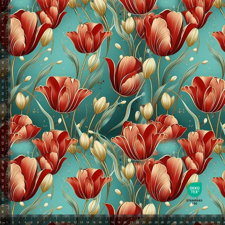 Jersey print med Røde tulipaner i en super god kvalitet. Kvaliteten på stoffet er bomuld 95% og lycra 5%
