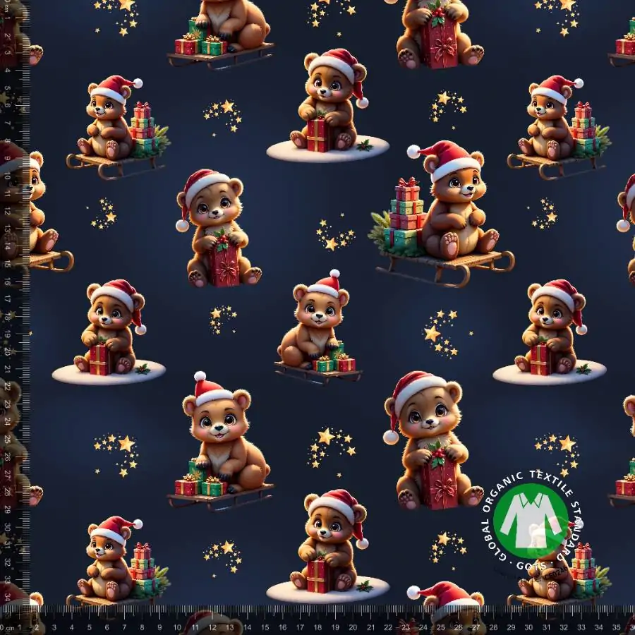 Jersey print med søde julebjørne – navy, er i en super god kvalitet. Kvaliteten på stoffet er bomuld 95% og lycra 5%