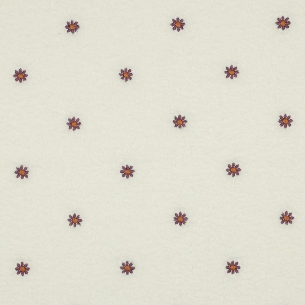 Teddy med broderi – Ecru med lilla blomster er dejligt blødt og er perfekt til en vest, trøje eller en jakke. Kvaliteten er i 100% polyester.